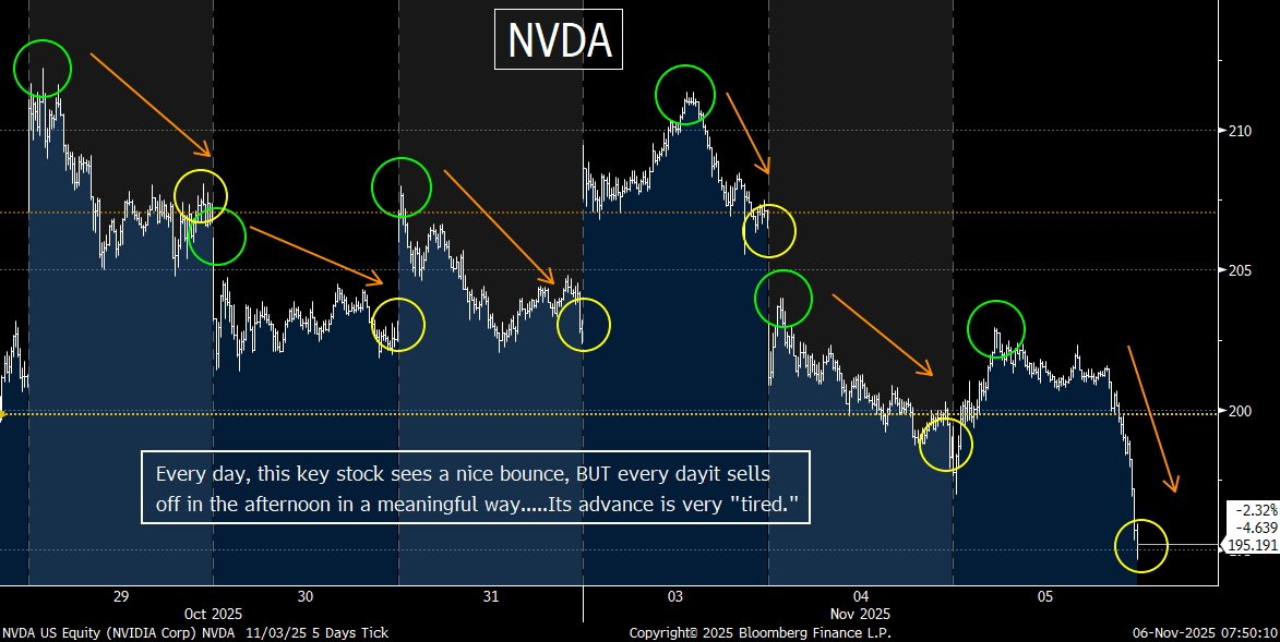 If there was one item that was disappointing from yesterday’s action was that the market saw a rather steep decline in the last 30-45 minutes of the day. As we highlighted yesterday, this is something which has been taking place every day for over a week now. This new trend is quite different than we’ve been seeing for most of the past six months. In fact, just the opposite had been the norm. So, the fact that these late-day sell-offs continue to be the norm…tells us that this rally is indeed getting tired…as we still believe that a near-term pullback in the stock market is likely…even if the market is headed higher over the intermediate-term…….(Also, as you can see from the updated chart below from Monday, the exact same thing is taking place in the most important stock in the market…Nvidia.)