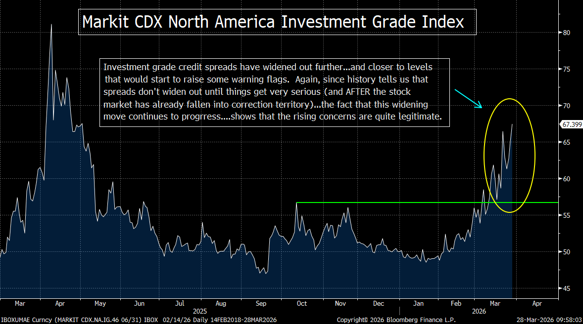 It’s also important to point out that the growing problems in the credit market are not isolated to private credit. There are also key issues to consider in the public credit market. First of all, the HYG high yield ETF is breaking down quite badly from its multi-month sideways range…and high yield credit spreads are widening out even further…..The same is true for investment grade spreads…..Also, given that a full HALF of investment grade debt is rated BBB today (vs. 1/3 just before the GFC), any broad string of downgrades will push A LOT of corporate debt down to junk status. Since many institutional investors cannot own junk paper in their portfolios, that could act like a big margin call in the credit market!