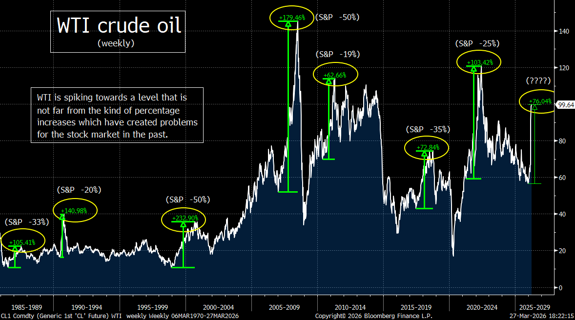 ---1) If you look at history, it tells us that if the price of oil stays as high as it is now…for just a short while longer…the stock market is not even half way through its decline yet……President Trump will not be able to change the narrative with a flip of a switch…like he did last year on the tariff issue. Therefore, unless the next surge in the attacks by the US and Israel are incredibly decisive, the line of least resistance for stocks is still lower.