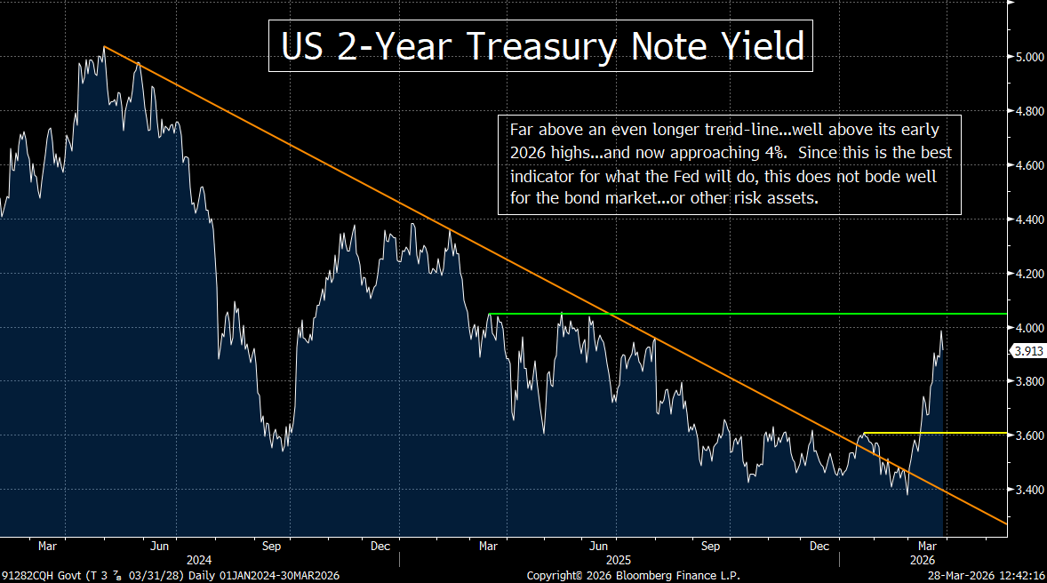 In other words, if the yield on the 2-yr note remains elevated…and especially if it continues to push higher…it’s not out of the question that the Fed could indeed hike this year. (Again, that is not our base case, however.)