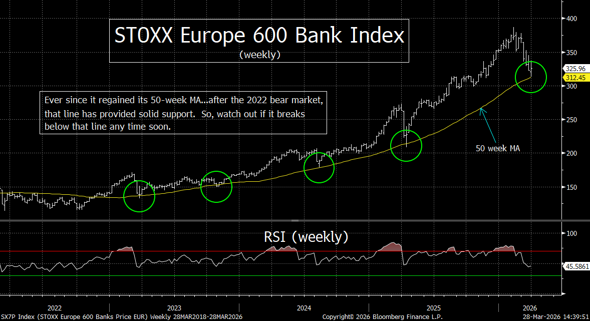 The 50-week MA has provided excellent support for this index ever since it regained that line following the bear market of 2022. Therefore, if it breaks below that line in any significant way, it’s going to send up a bigger warning flag on this group than already existed. That, in turn, would raise more concerns about the European stock market in general. The bullish consensus around the Street on Europe has certainly reversed since the war started. If their bank index breaks below its key support level, these new concerns should rise in a material manner.