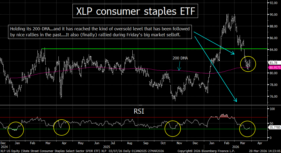It’s interesting to note that the utility group rallied every single day last week, so that one is looking more and more like a good defensive play. As for the consumer staples, the XLP consumer staples ETF bounced off an oversold condition late last week…and is now trying to regain its 200-DMA. If it can indeed regain that line in a material way, it will give us a lot more confidence that this group can outperform going forward.