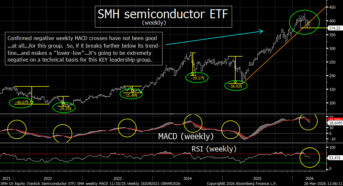 Google (GOOGL) announced a new memory algo called TurboQuant…which will allow for more efficient use of storage needed for AI development by reducing the amount of key value cache required for AI workloads. The memory chip stocks (like Micron, Western Digital, Sandisk, etc.) were hit especially hard…and the semiconductor equipment manufacturers (like Applied Materials, Lam Research, KLA, etc.) saw significant declines as well. This caused the SMH semiconductor ETF to drop by 4.5%...which took it back down to its key support level (its 100-DMA).