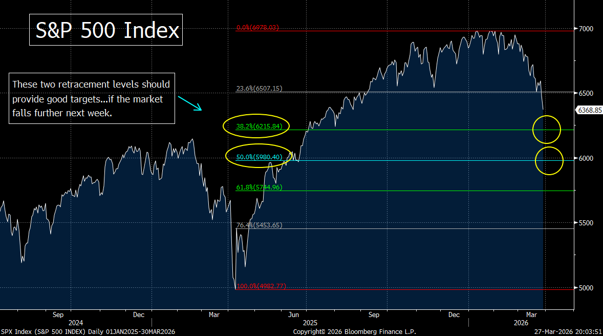 In the second chart on the SPX, we have provided some possible near-term targets. The first one is 6,215…which is a Fibonacci 38.2% retracement of the entire rally from last April’s low. Next support comes in at the 50% retracement level…down at 5,980. Of course, if that level is broken, there could be plenty of further downside potential…especially if things deteriorate badly in the war.